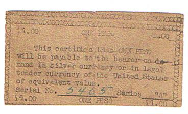 This certifies that ONE PESO will be payable to the bearer on demand in silver currency or in legal tender currency of the United States of equivalent value.